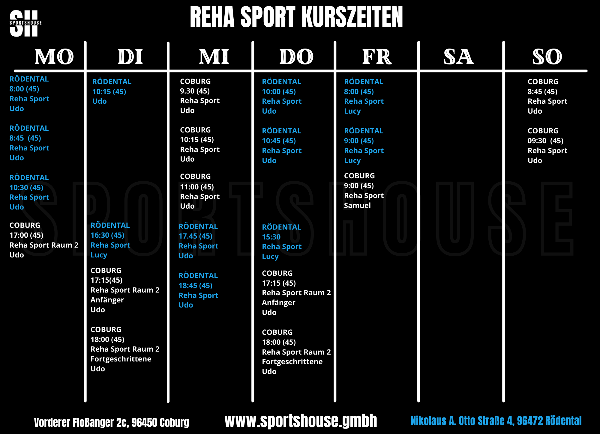 Die Reha-Kurse finden alle in der Gruppe statt. Die Teilnehmer trainieren gezielt ihre Kraft und Beweglichkeit, sowie durch die Stimulation des Herz- Kreislaufsystems die Stärkung des Immunsystems. Grundsätzlich steht die Freude an Bewegung im Vordergrund und es werden alle Teilnehmer behutsam an die Übungen herangeführt